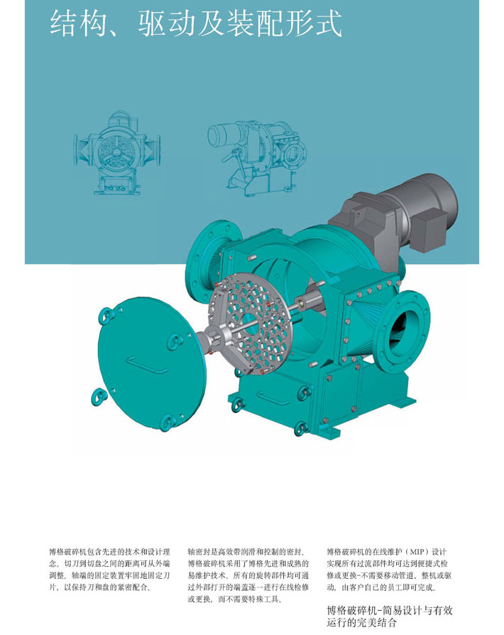 MIP=在線式維護:博格破碎機的一側(cè)軸設(shè)計大大簡化的維修。所有的過流部件都可以通過打開一側(cè)的蓋板而被輕松的取出并更換,而不需要移動管道、驅(qū)動或?qū)⒃O(shè)備拆除