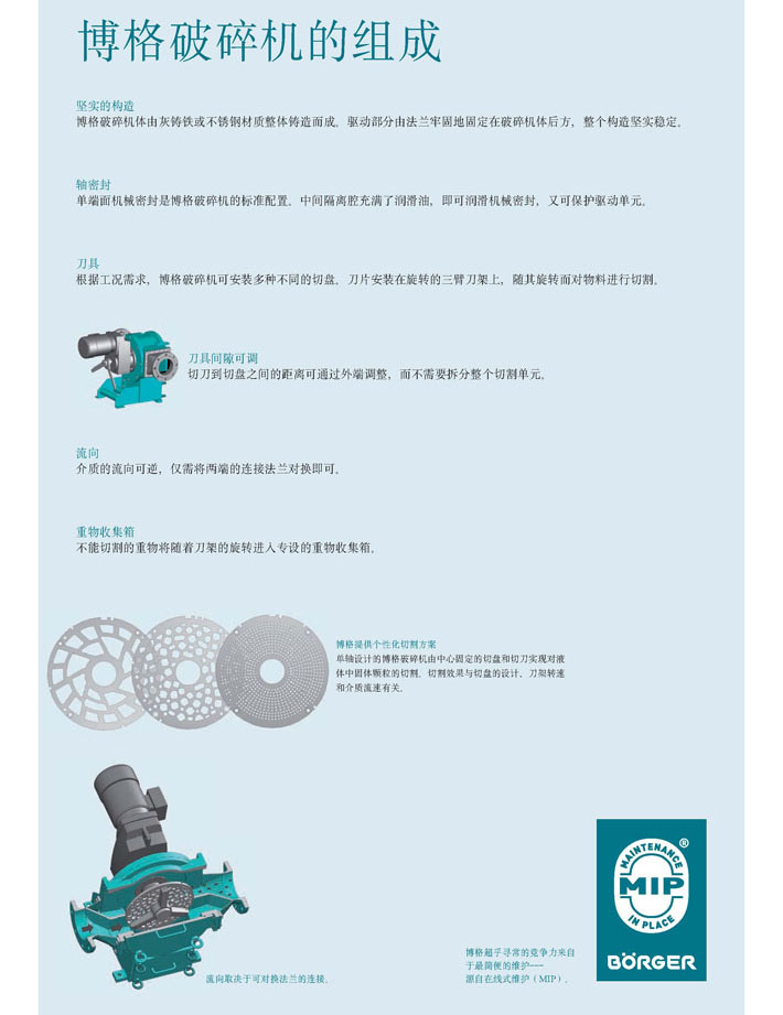 無障礙運行:博格破碎機與博格凸輪泵的完美組合可以帶來介質(zhì)的平穩(wěn)輸送。破碎機將流體中的固體顆粒切割破碎,均勻的流體介質(zhì)由下游的凸輪泵輸送出去。