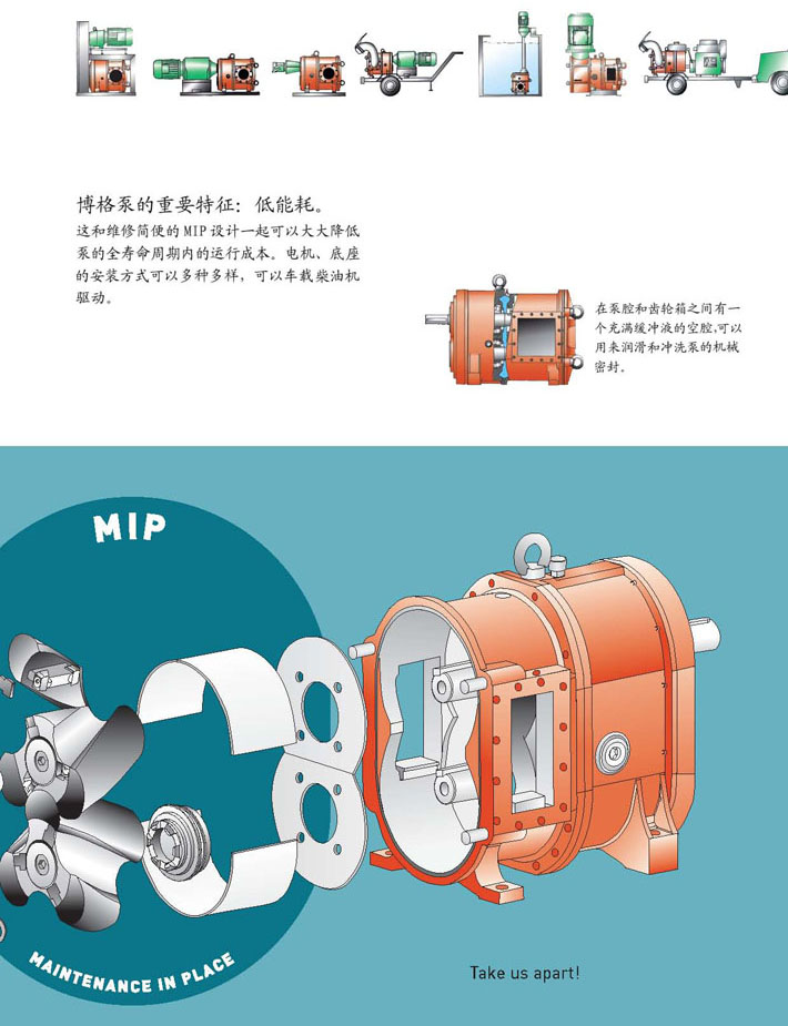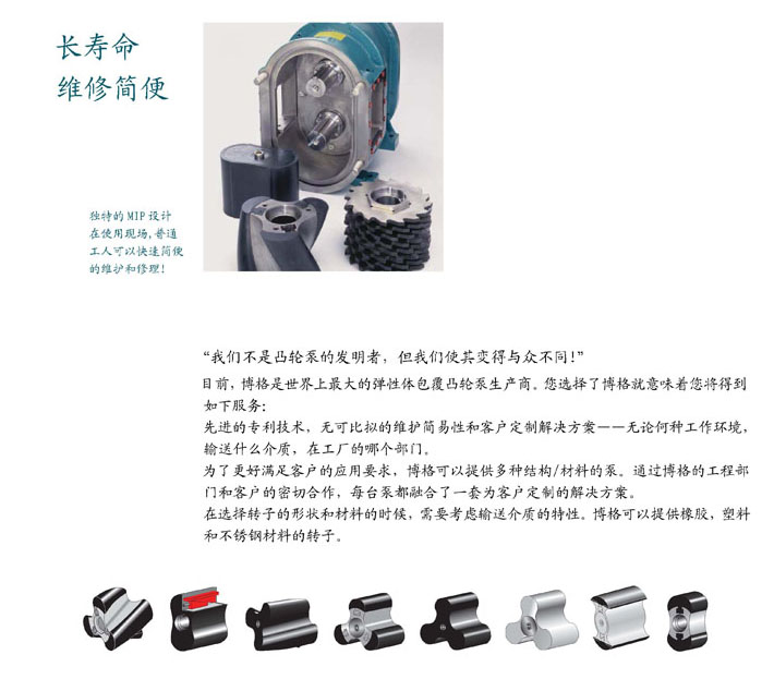 3.★產(chǎn)品結(jié)構(gòu)、功能特點(diǎn):博格凸輪泵結(jié)構(gòu)簡單、精巧、自吸、無閥式的凸輪泵已經(jīng)在各個(gè)行業(yè)開辟了自己的市場。博格凸輪泵包括六個(gè)系列的16個(gè)型號,流量范圍在0.5—1200m3/h(2.2—5000加侖/分鐘),博格泵有多種結(jié)構(gòu)和材料可供選擇,從而保證根據(jù)為每一位用戶提供理想的泵型。例如,對于轉(zhuǎn)子形狀、轉(zhuǎn)子尖、橡膠涂層、軸密封、泵殼和保護(hù)襯板等部件,博格公司都可以根據(jù)實(shí)際工況需要而做出相應(yīng)的選擇。同時(shí),博格公司可以提供整套的機(jī)組,包括驅(qū)動(dòng)器、聯(lián)軸器、底座等,以及單獨(dú)設(shè)計(jì)的可移動(dòng)式泵組或液下式泵組。
