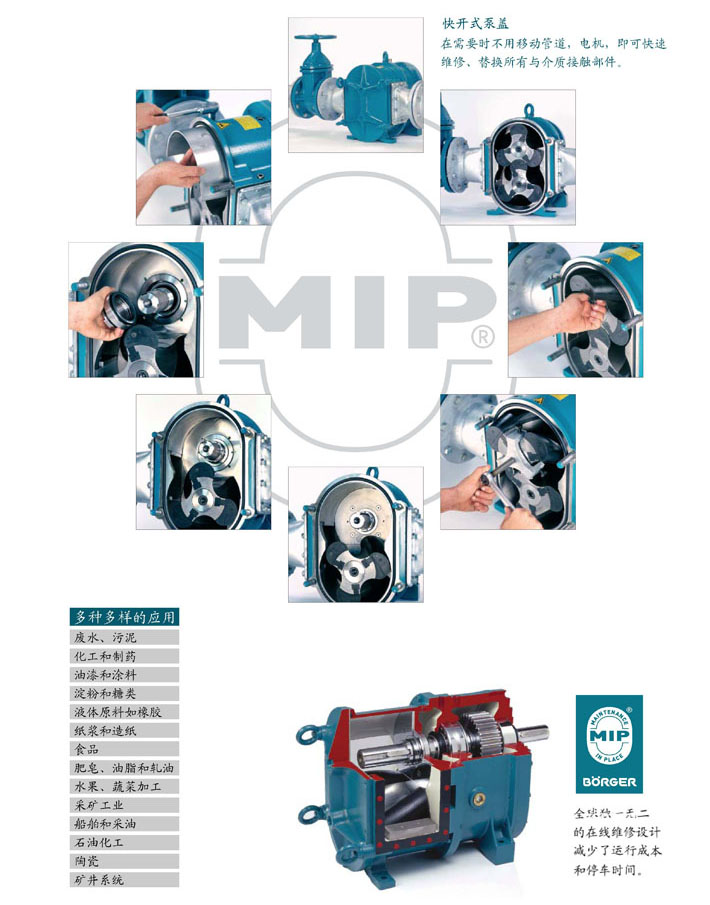 ☆MIP在線式維修:所以部件均可通過快速開啟式泵蓋的打開,逐一檢修或更 換;