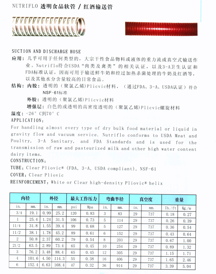 技術參數(shù) ◆透明食品級衛(wèi)生軟管 ◆口徑:1/4寸、1/2寸、6/15寸、3/8寸、3/4寸、1寸、1-1/4寸、1-1/2寸、2寸 ◆內(nèi)層:硅橡膠無毒、透明。 ◆加強層:熱塑管及合成物加強。 ◆外皮表層:平滑、透明。 ◆工作壓力:4.5BAR(60PSI)-17.2BAR(250PSI) ◆工作 溫度:-5攝氏度-150攝氏度。 ◆應用于食品及飲料輸送液體、氣體、日用化學行業(yè)輸送原料。 |